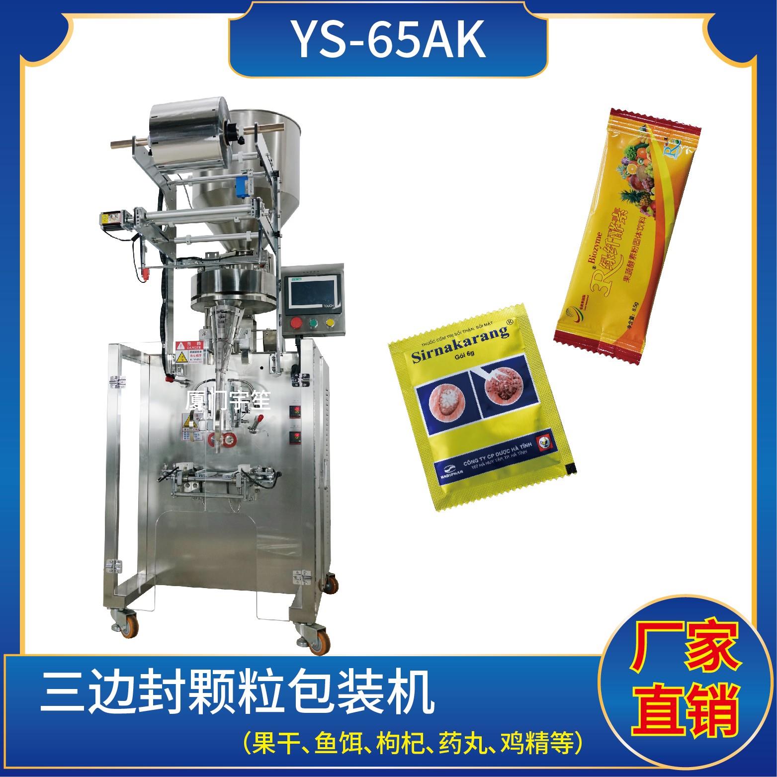 YP-65AK 三邊封顆粒包裝機特 點 1、適用于食品、醫(yī)藥、化工、化妝品行業(yè)中顆粒物品的計量包裝。2、可自動完成制袋、計量、下料、封合、分切、計數(shù)、且可根據(jù)客戶要求配置打印批號等功能。3、觸摸屏操作,PLC 控制,驅動步進電機控制袋長,性能穩(wěn)定、調整方便、檢測準確。智能式溫控儀,PID調節(jié),保證將溫度的誤差范圍控制…