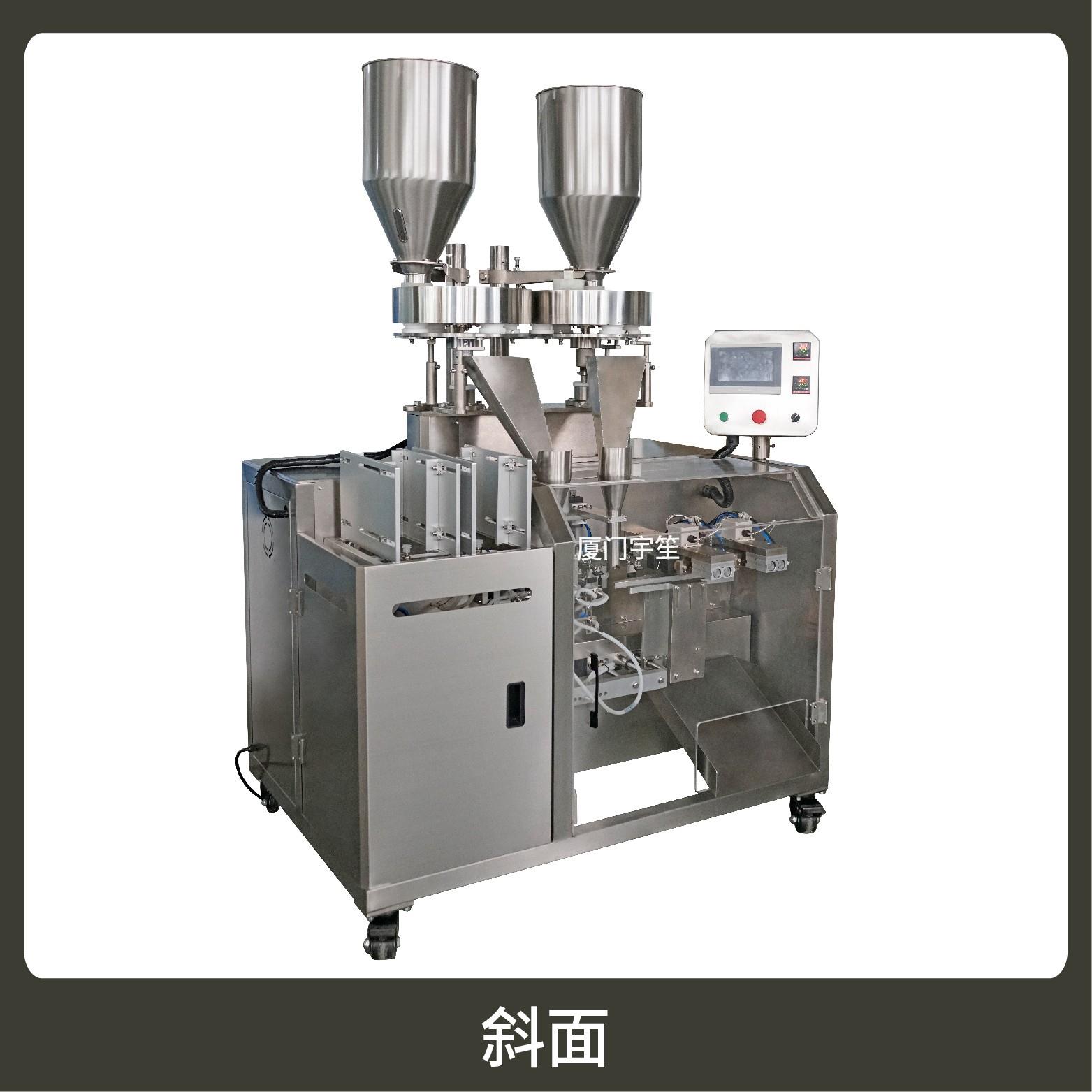 1、成品雙出,速度快,包裝流程全自動(dòng),無(wú)需人工操作??筛鶕?jù)充填物料的性質(zhì)選配不同的下料結(jié)構(gòu)。