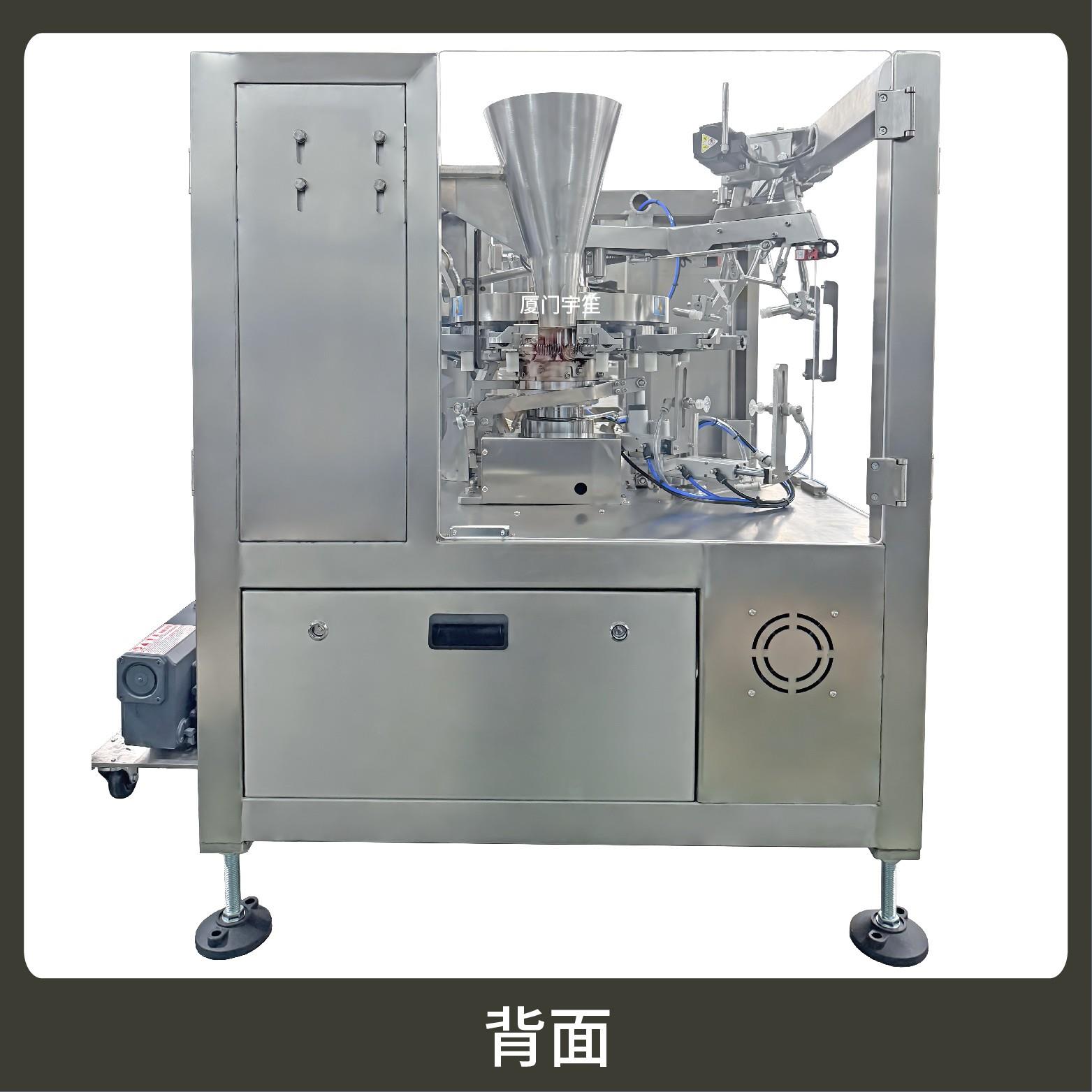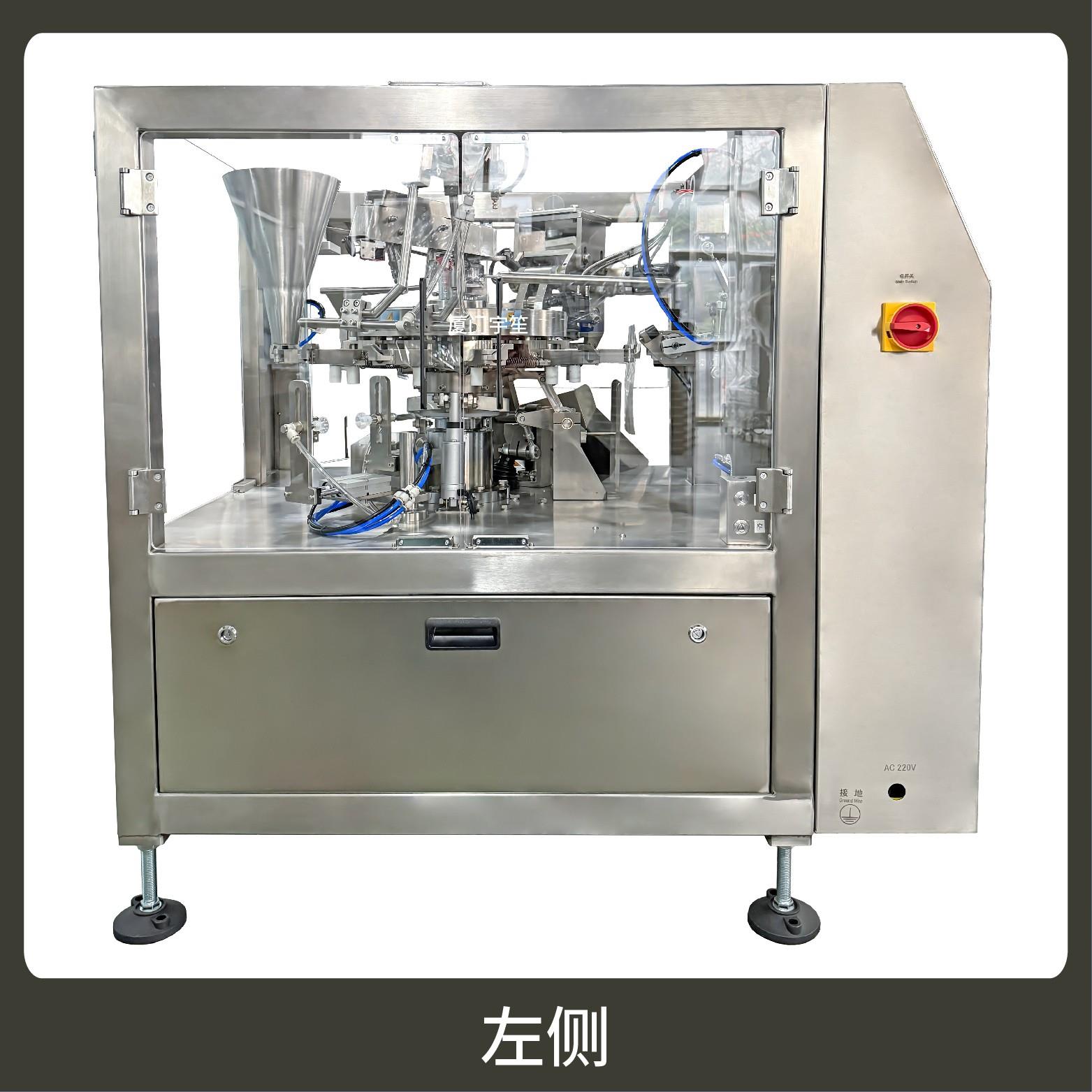 The machine adopts an intermittent rotating platform with multiple stations (bag feeding, bag opening, filling, sealing, etc.) distributed circularly. Continuous process connection is realized by rotation, with compact structure, space saving, and high efficiency for high-volume packaging requirements.